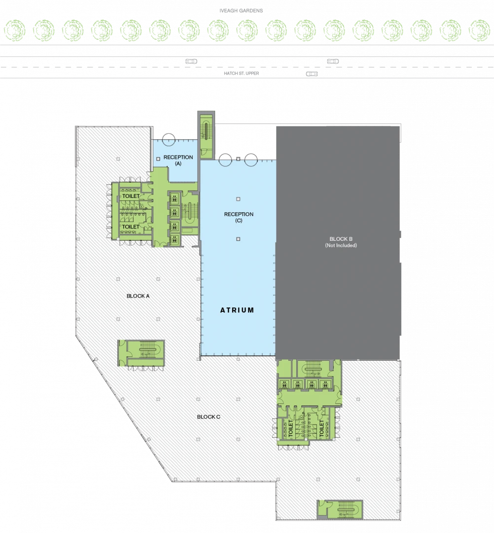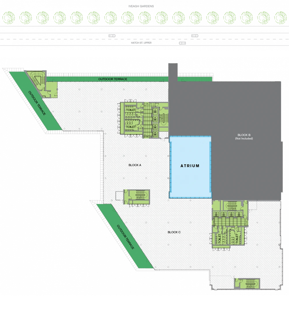 A full-height glazed atrium floods the building with natural light, creating a bright and welcoming space with panoramic views of the Iveagh Gardens. A floor to ceiling height of 2.75m to improve employee wellbeing and welcome in natural light.