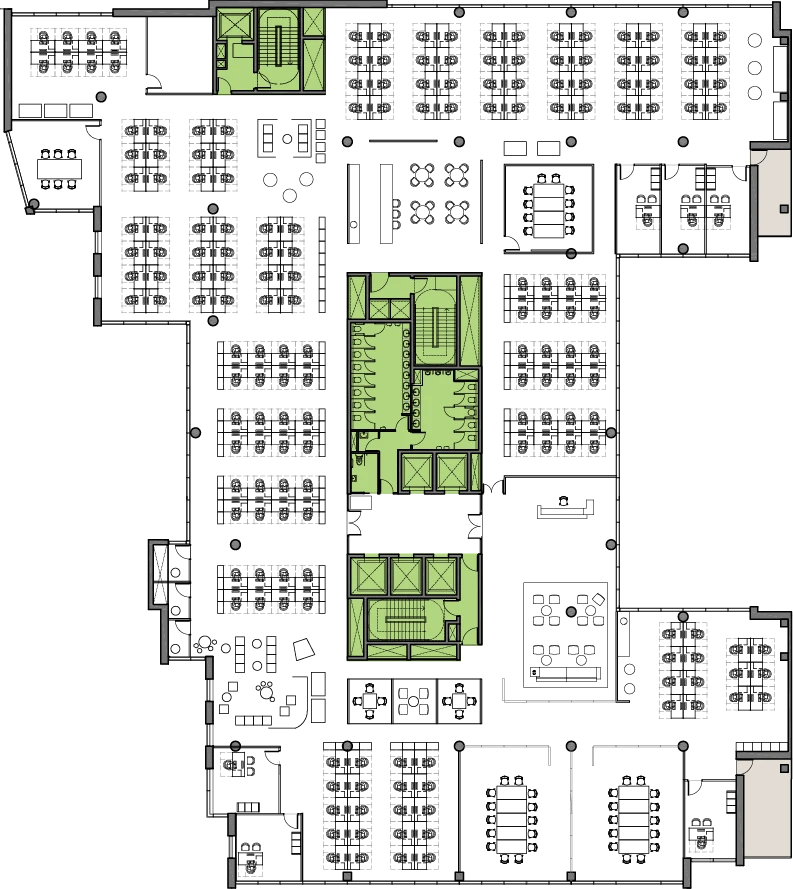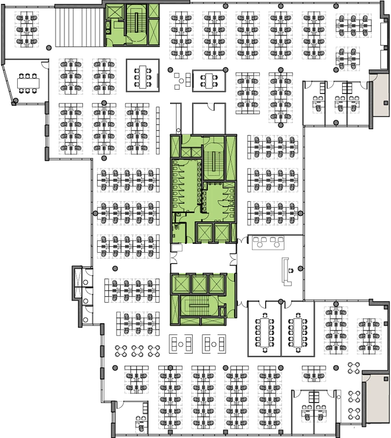 Floor plates are designed for maximum flexibility, and suitable across sectors. Each floor can accommodate up to two tenants and meeting rooms can be designed to add further flexibility through wall construction, allowing them to be reconfigured into larger “town hall” style spaces when required.